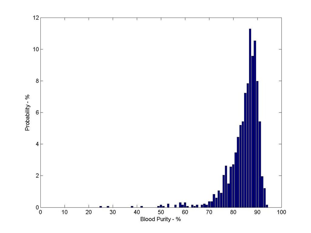 Blood purity (0-100%) is measured by the proportional amount of pure red blood of the whole surface area of the blood. Pure blood is red with dense dark lined fibrin network. In state of pure blood the blood purity is over 90% and erythrocyte sedimentation rate under 5 mm/h. If you are in state of pure blood continue living as you have done. The purest blood is in vegetarians and those meat-eaters who drink alkalizing liquids. The worst blood is in alcoholics, smokers, all-nighters, obese and sick people. Drinking low pH acidic liquids lower the purity of the blood.